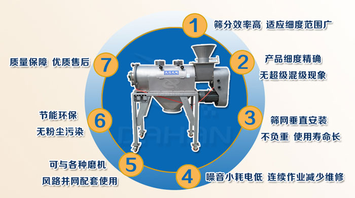 4、篩網(wǎng)受旋風的沖刷,可自動清網(wǎng)。