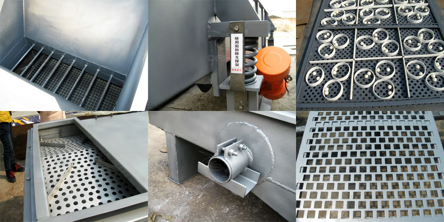 5、電機臺座:安裝振動電機,使用前連接螺釘必須擰緊,特別是新篩機試用前三天、必須 反復(fù)緊固,以免松動造成事故。