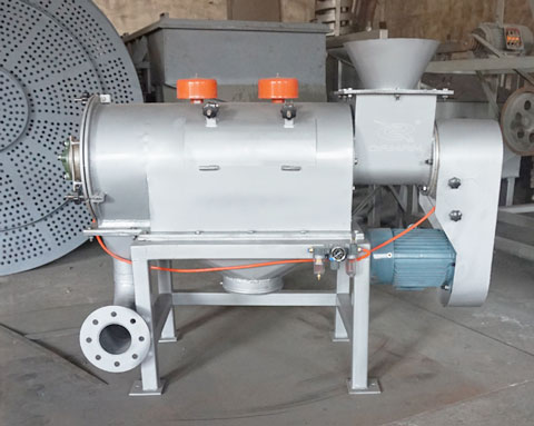 。其篩網(wǎng)為圓筒狀,置于機(jī)體內(nèi),物料通過(guò)螺旋輸送系統(tǒng)后,和氣流混合、霧化進(jìn)入網(wǎng)筒內(nèi);通過(guò)網(wǎng)筒內(nèi)風(fēng)輪葉片使物料同時(shí)受離心力和旋風(fēng)推進(jìn)力,從而近使物料噴射過(guò)網(wǎng),由細(xì)料排出口排出,不能過(guò)網(wǎng)的物料沿網(wǎng)筒壁從粗料排出口排出。
